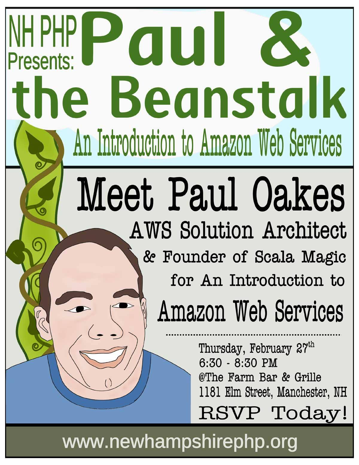 event flyer featuring comic version of man posing in front of an oversized beanstalk
