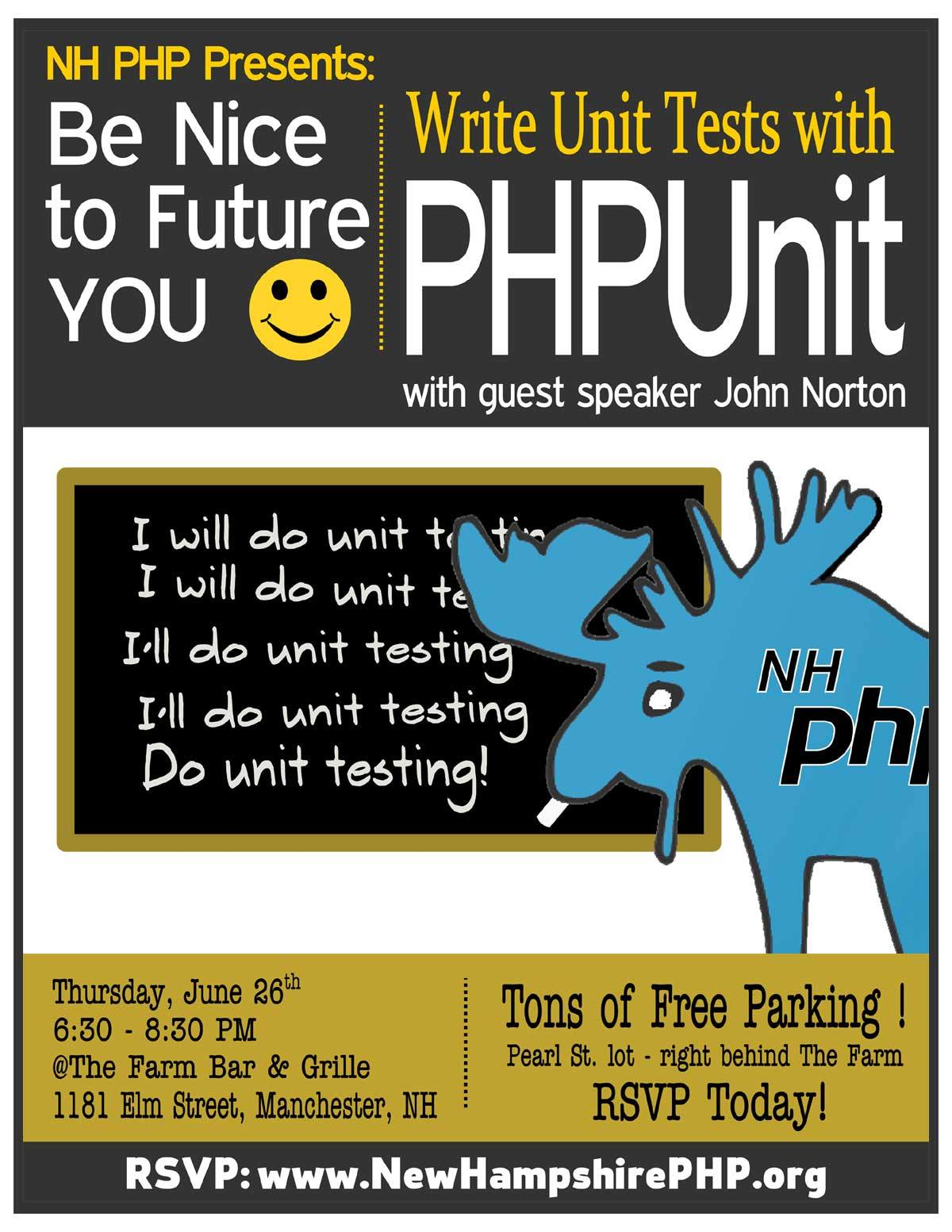 graphic even flyer with a large blue moose standing in front of a chalk board writing "I will do unit testing" over and over