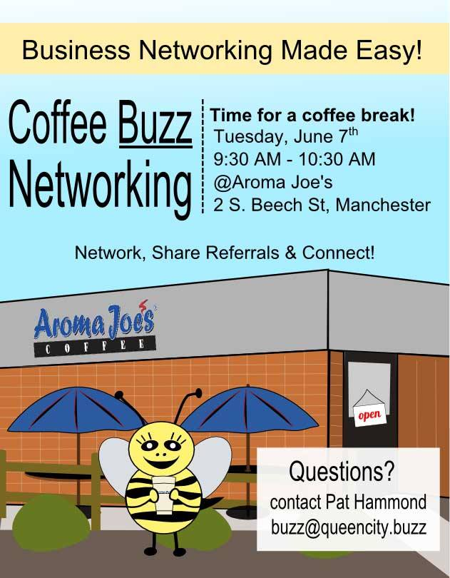 networking event flyer featuring giant bee holding a cup of tea standing in front of a coffee shop