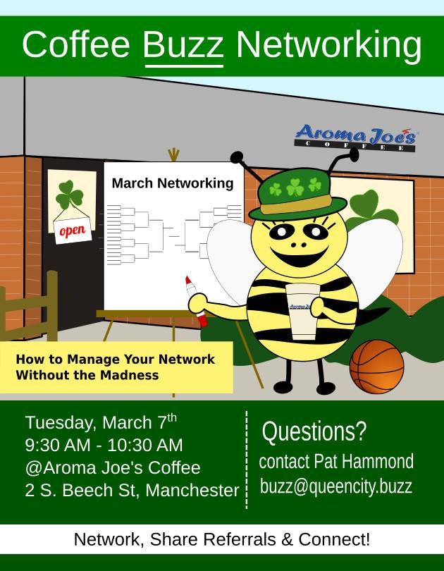 networking event flyer featuring a giant bee wearing a green hat with shamrocks and holding a cup of tea standing in front of a whiteboard and a coffee shop